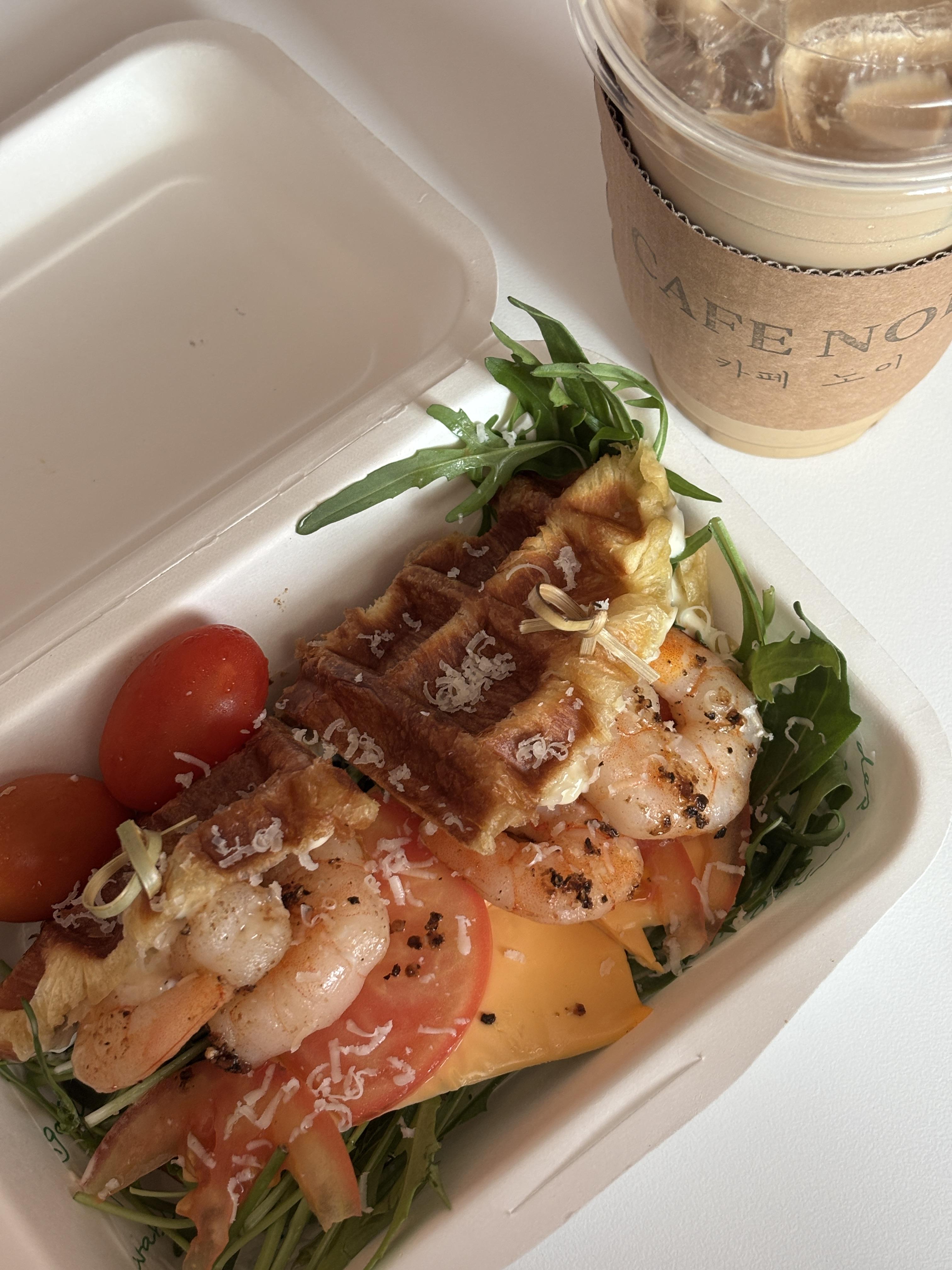 평소 새우를 안 좋아하는데 매콤하다는 소리에 주문한 슈림프 크로플 샌드위치